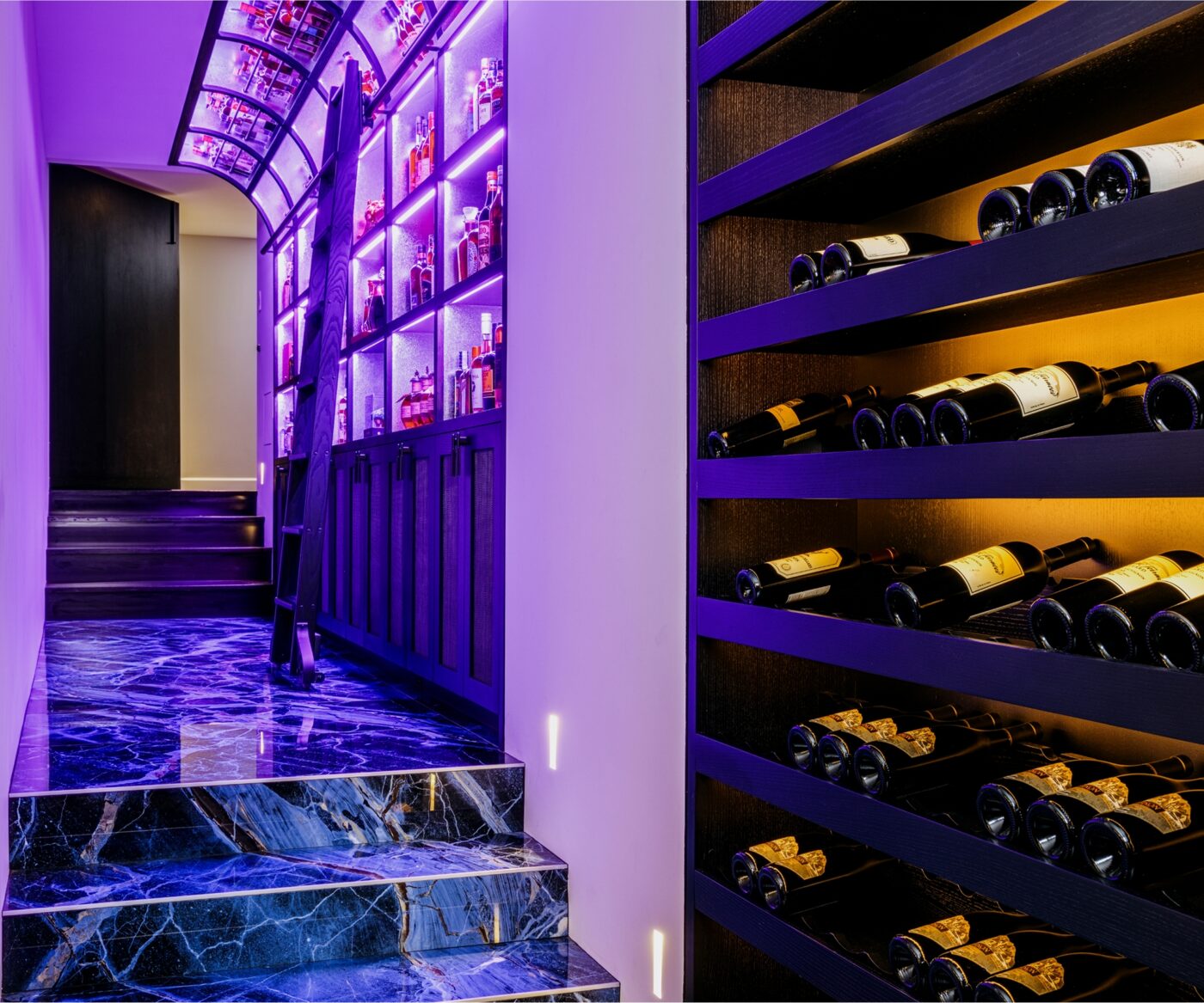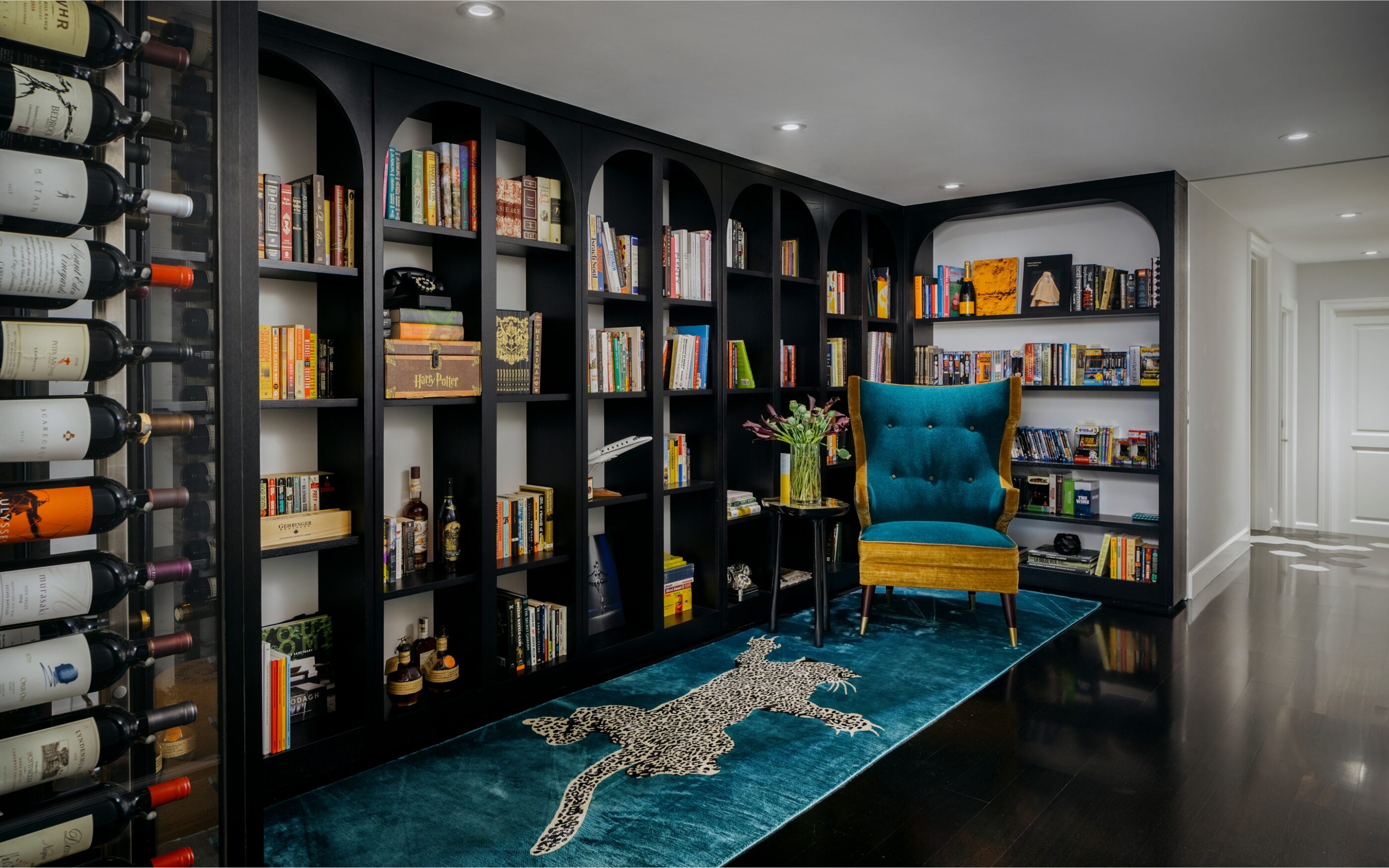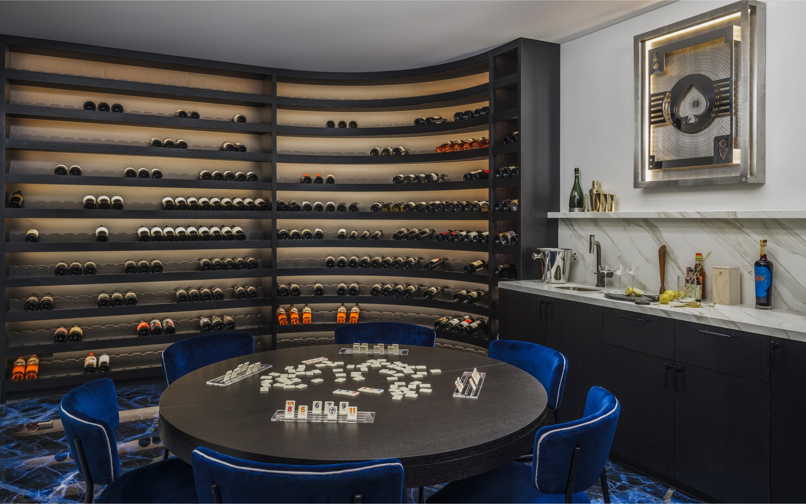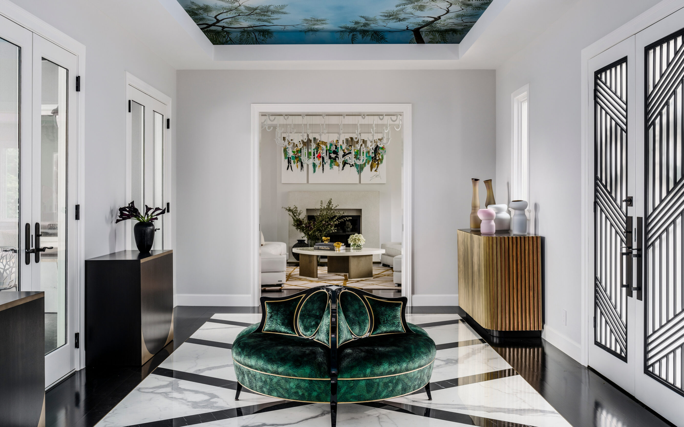 This project perfectly illustrates the design capabilities of Lizette Marie Interior Design – collaborative, full of life, and laden with personal details that reflect the client. Highlights from this full-scale renovation include a hallway library that reveals a secret passageway to a sultry wine lounge and an illuminated game room with custom millwork, and electric blue marbleized flooring. The entryway serves dual purpose as a stunning welcome, while consoles conceal foldout tables to host elaborate dinners. The light-filled space underneath a custom sky mural nods to the home’s park-like surroundings.